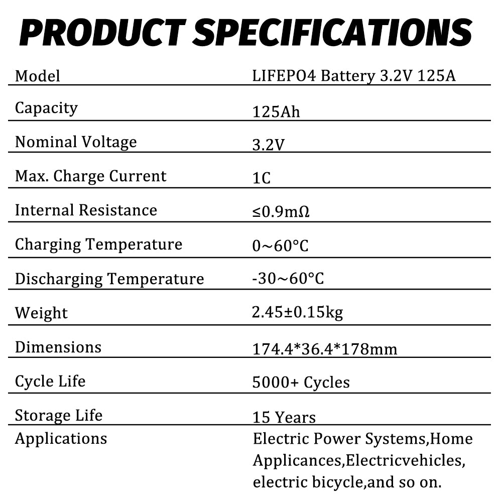 The Lifepo4 CALB 3.2V 125Ah battery are original brand new cell with clear QR code. For easy assemble, we will weld M6 studs on the cell. Each battery will send 1 pcs copper busbar and 2 pcs nuts.