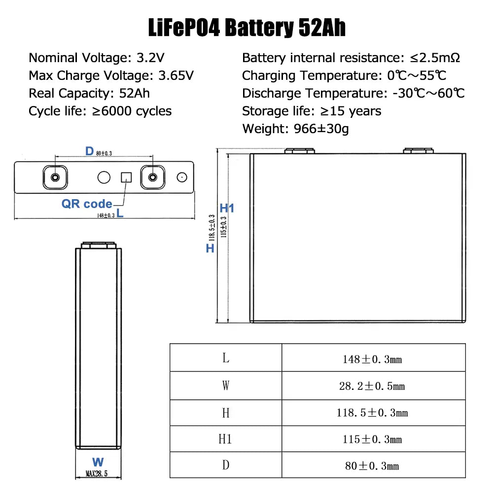 The Lifepo4 GOTION 3.2V 52Ah battery are original brand new cell with clear QR code. For easy assemble, we will weld M6 studs on the cell. Each battery will send 1 pcs copper busbar and 2 pcs nuts. The price to European countries are include custom clearance and tax.