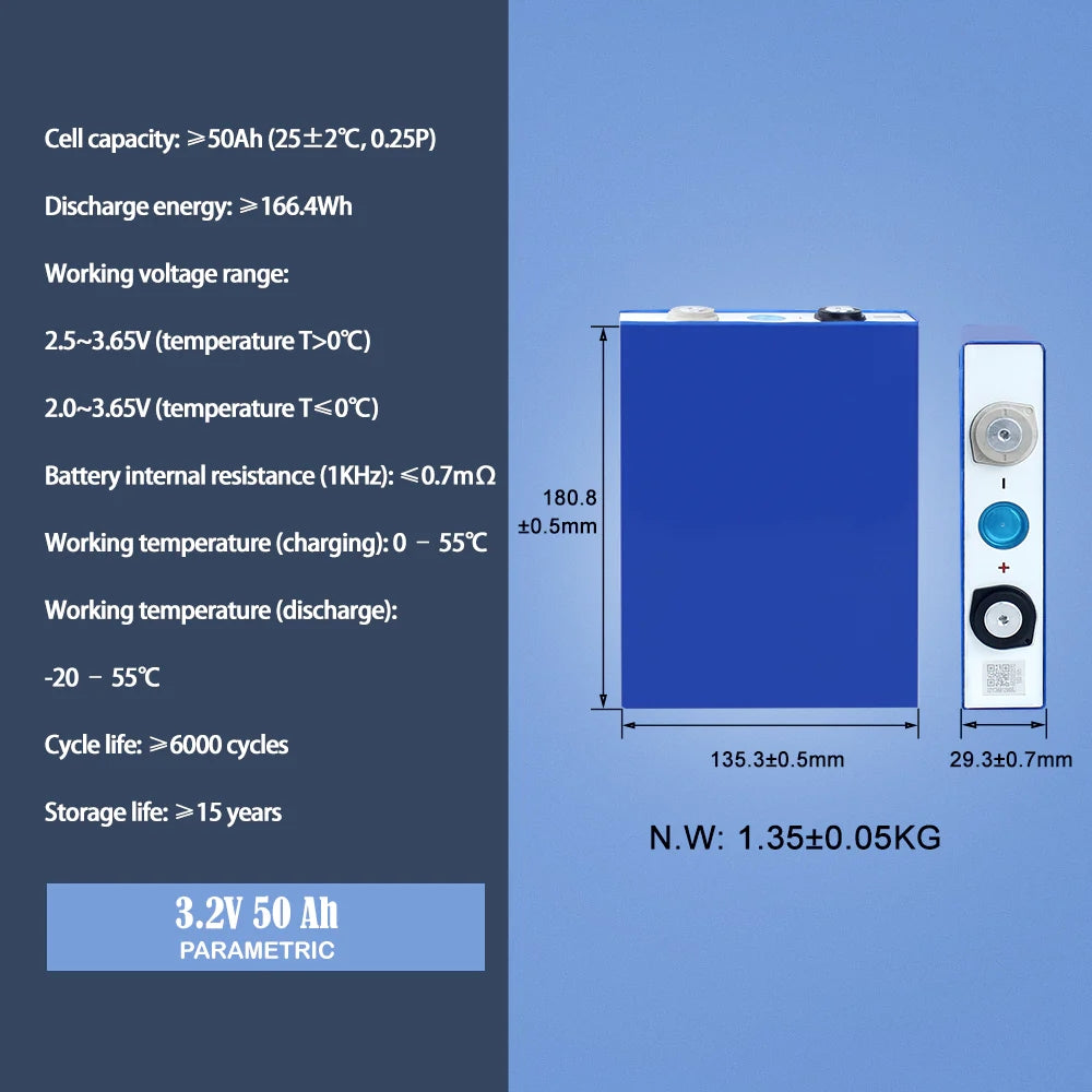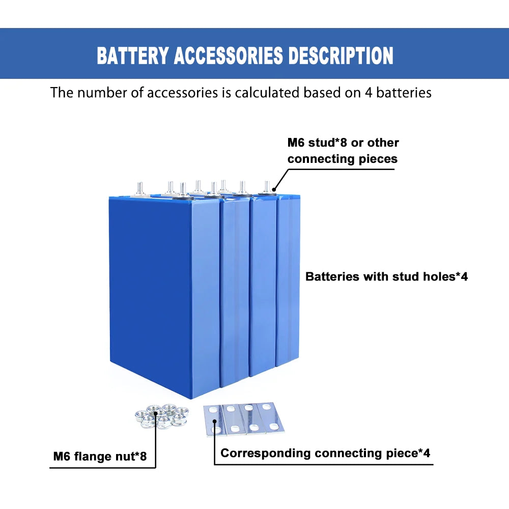 The Lifepo4 EVE 3.2V LF 50K battery are original brand new cell with clear QR code. For easy assemble, we will weld M6 studs on the cell. Each battery will send 1 pcs copper busbar and 2 pcs nuts. The price to European countries are include custom clearance and tax.