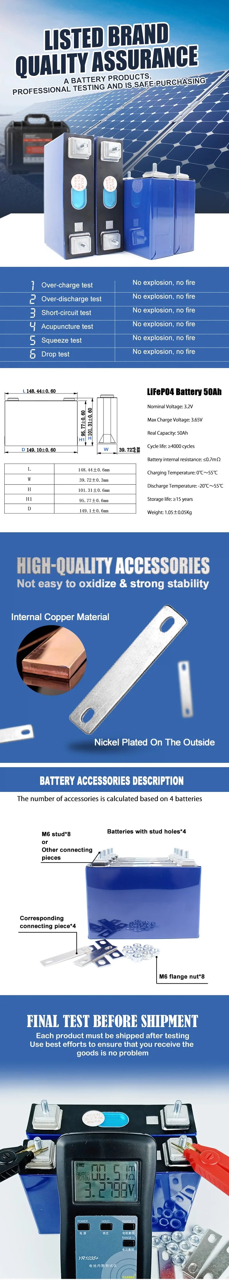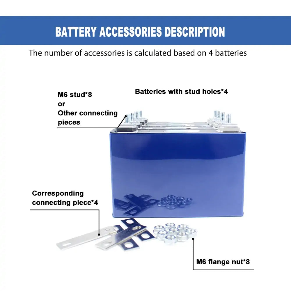 1. For easy assemble, we will weld the M6 studs on the cell, each battery will send 1 pcs copper busbar and 2 nuts. If you have other requirement of the screw size, please contact us.