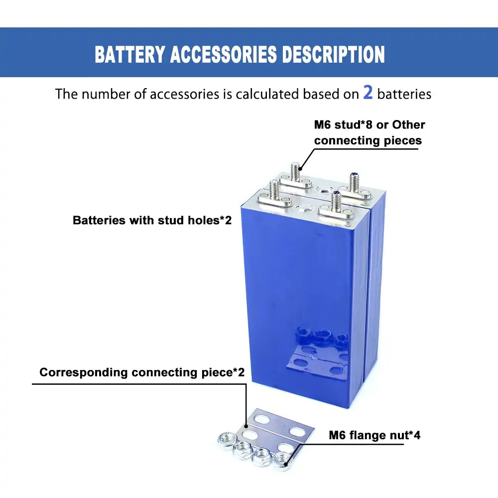 1. For easy assemble, we will weld the M6 studs on the cell, each battery will send 1 pcs copper busbar and 2 nuts. If you have other requirement of the screw size, please contact us.